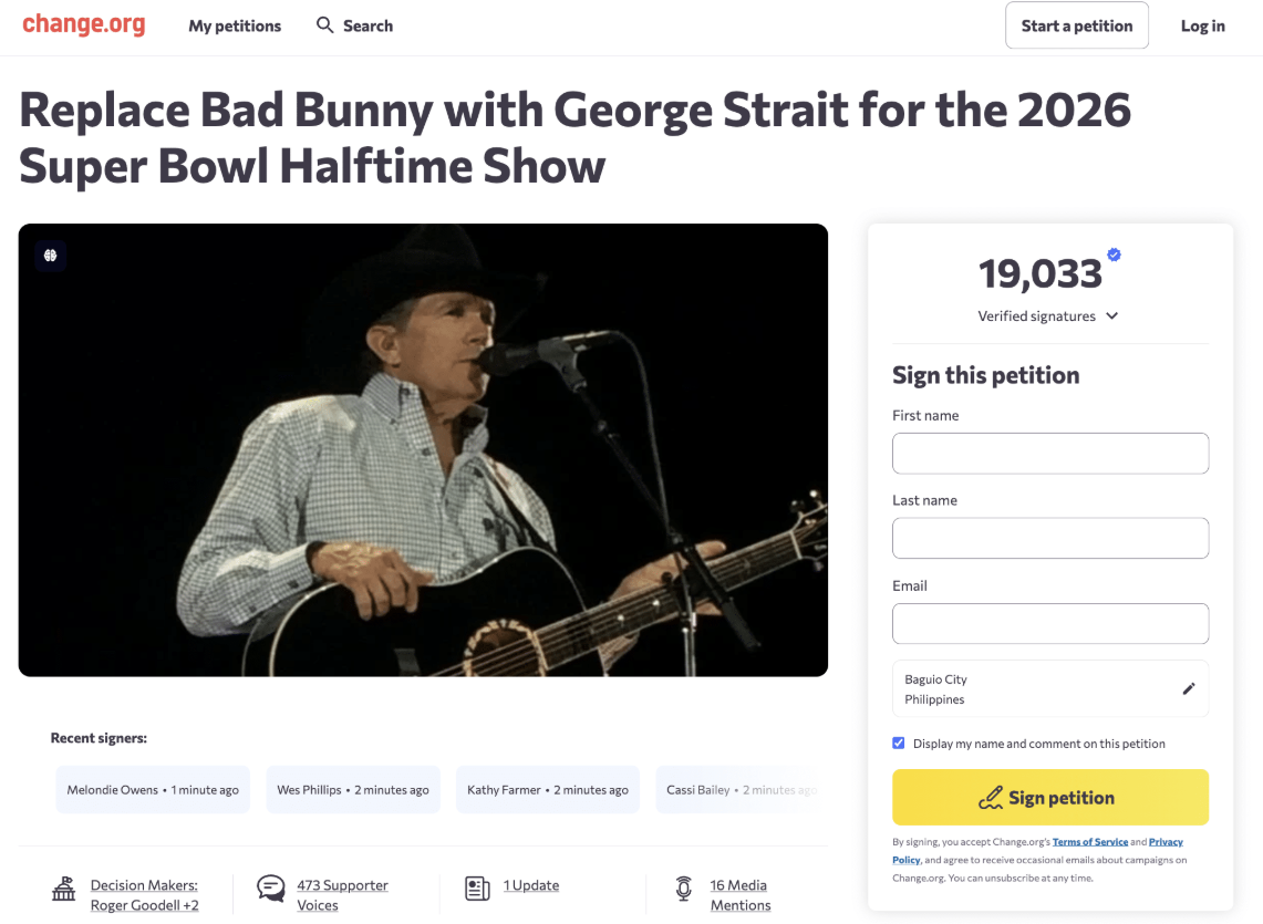 Supporters of the petition have flooded the comments with passionate messages that highlight frustration and pride in equal measure. One signer wrote, “Why would the Super Bowl in America, hosted by Americans, have a mainly Spanish singer? That makes no sense. Have the King of Country make this Super Bowl ten times better than last year.” Another added, “George Strait is a country classic, one hundred times better than Bad Bunny.”
